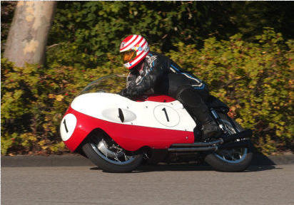 Brian rijdt ook de ex Mike Hailwood NSU Sportmax waarmee Mike 3e